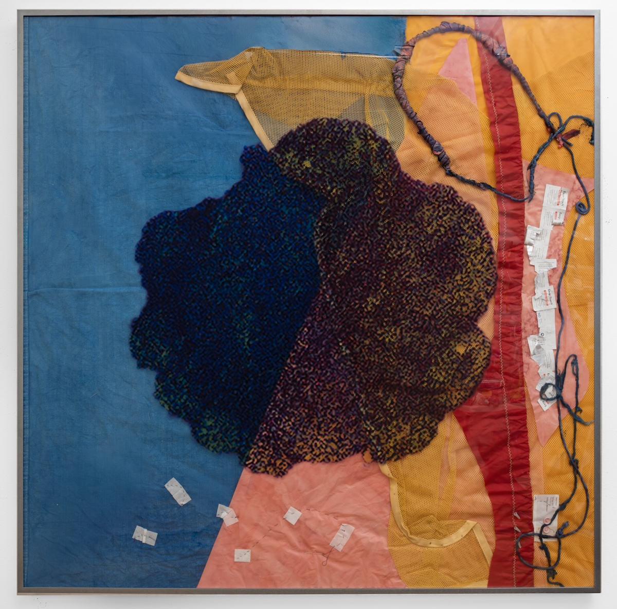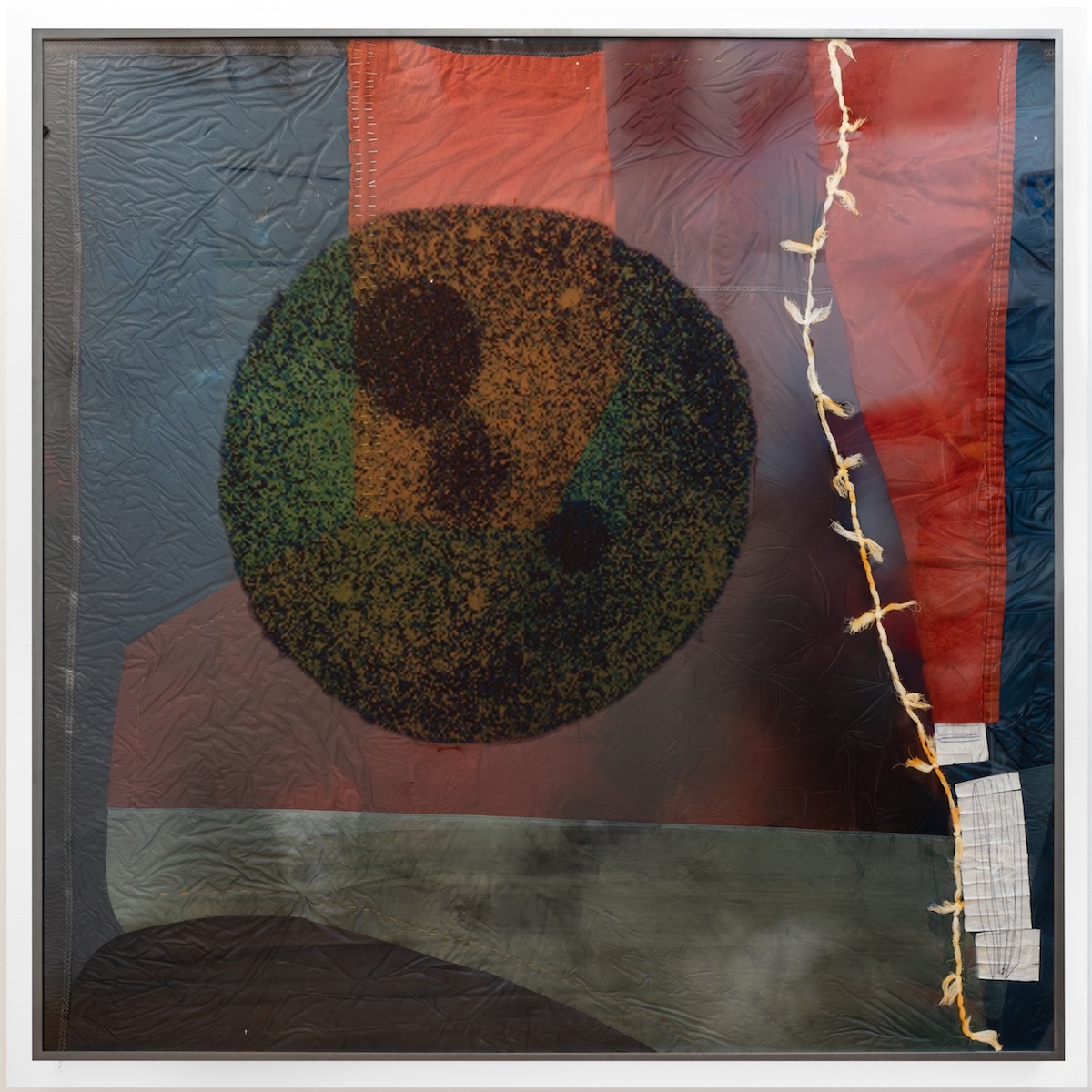 UV printing on plexiglass, thirty years old human embryo image, hand dyed fabric, sails, gauze pads, syringe wrappers, sewing pins, thread, aluminum frame. Photographs by Ocean Studios