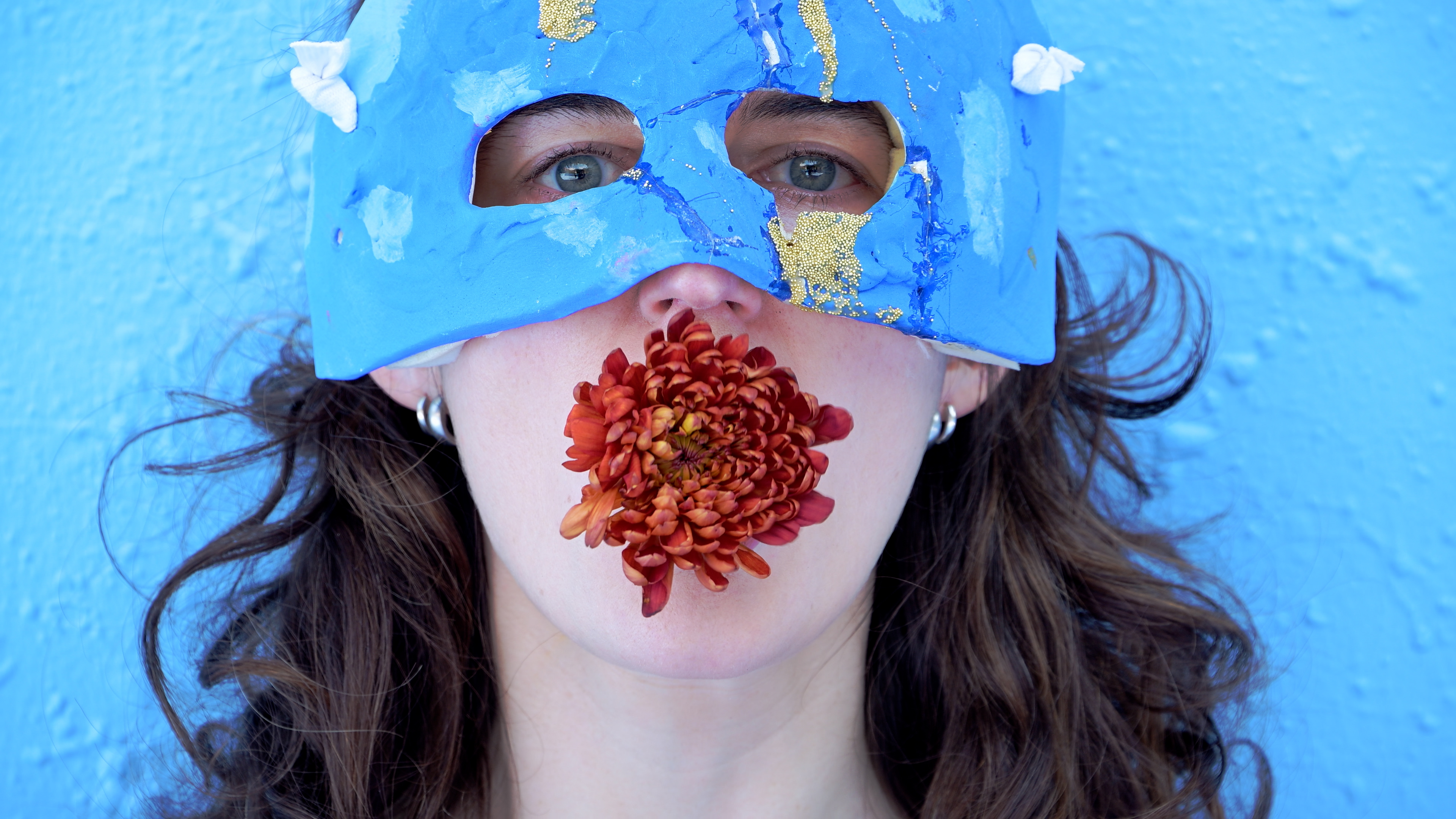 Materials: Oranges, bowls, mirrors, used IVF drug containers, syringes, plastic bags, ceramic masks, medical gloves, flowers, paper, fabric scraps, medical bills, genetic testing, sound recording from pregnancy stress test, natural dyes: turmeric, paprika, walnut.