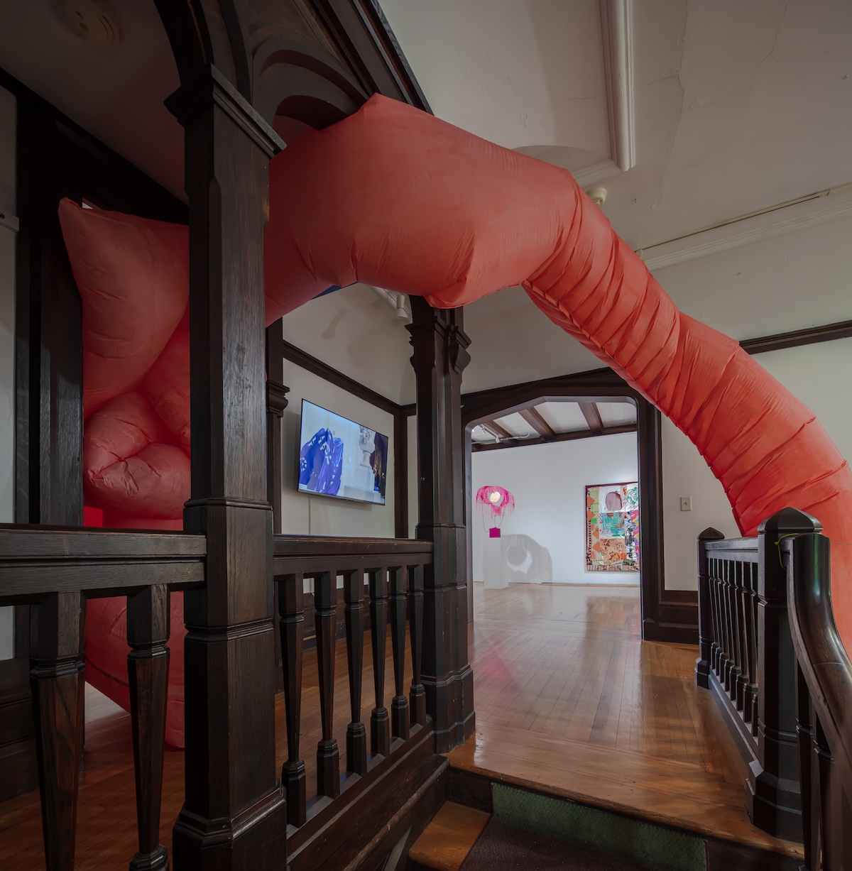 Lili and Lilu (red and pink inflatables), 21 x 9 x 5 feet, 18 x 8 x7 feet, 2023