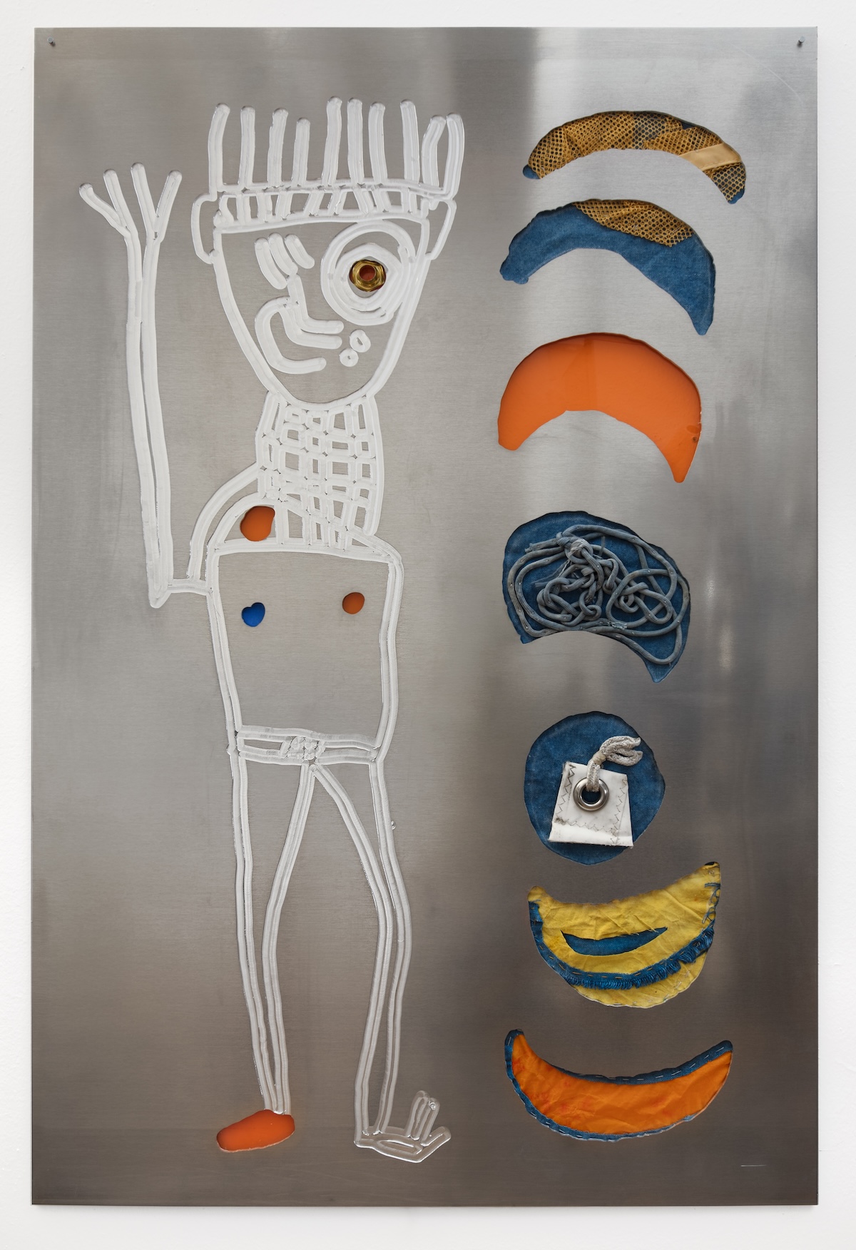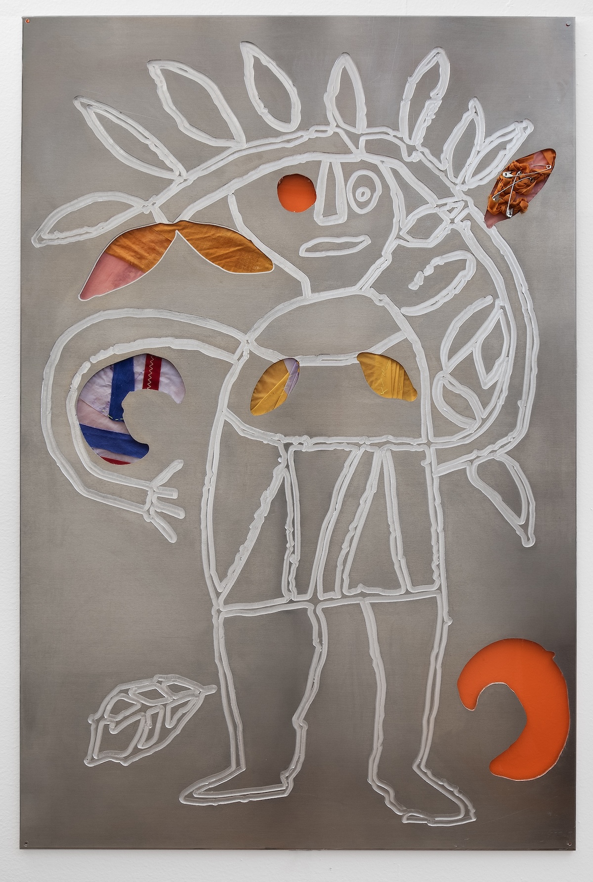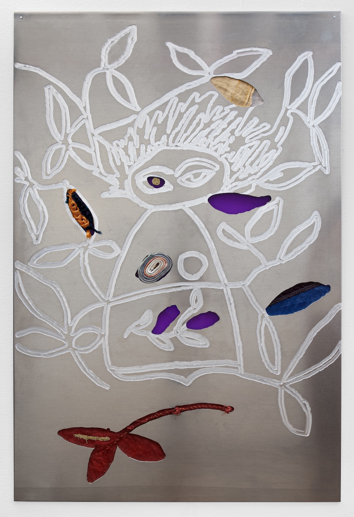Aluminum sheet, plexiglass sheet, hand dyed textile, thread.